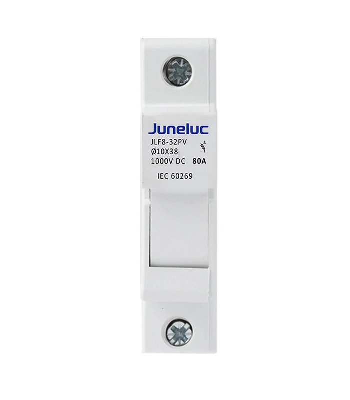 JLF8-….PV series fuses are designed with a rated operating voltage of DC1500V and a rated current of up to 80A. These fuses are primarily used in solar photovoltaic DC combiner boxes to interrupt overload and short-circuit currents caused by current feedback from PV modules or inverters, thereby ensuring effective protection of the photovoltaic components.